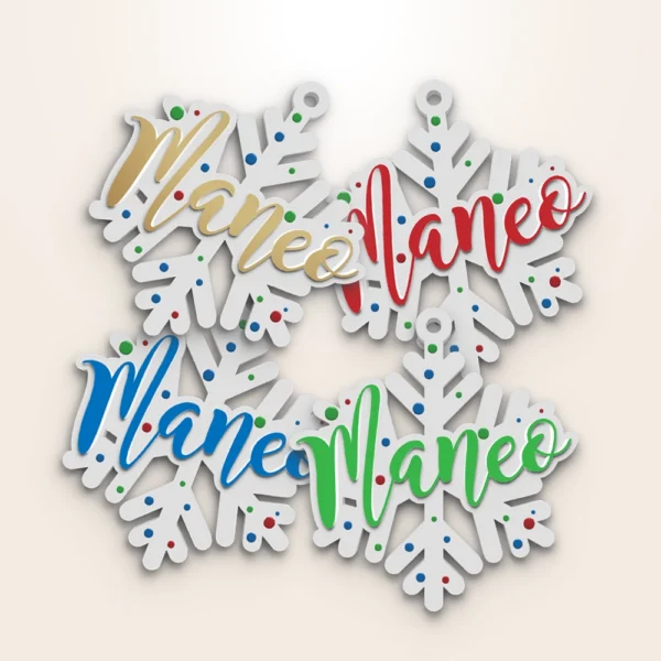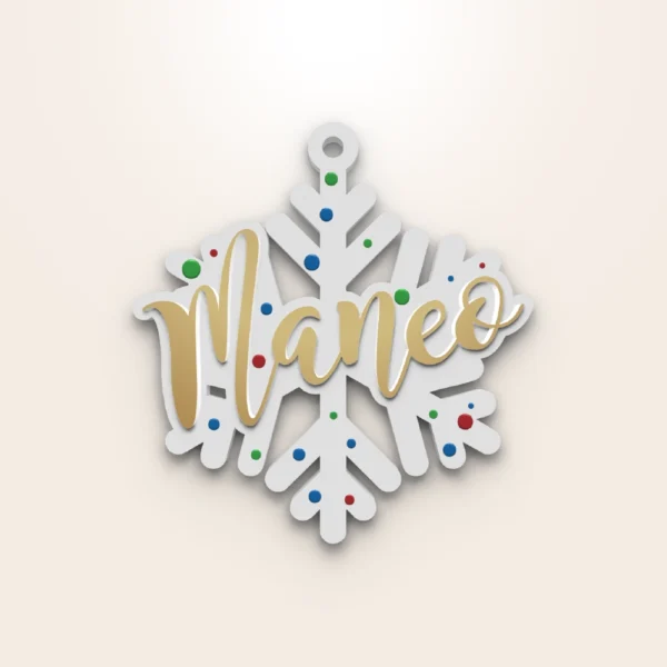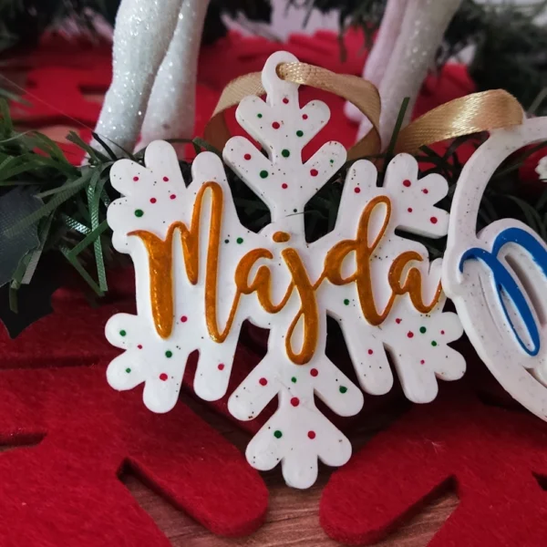 Elegantni ukras u obliku pahuljice sa naglašenimn zlatnim imenom u profinjenom stilu na bijeloj podlozi sa šarenim tufnicama. Idealan je dodatak vašem božićnom ili novogodišnjem drvcu, donoseći bezvremensku ljepotu i razigranu atmosferu.