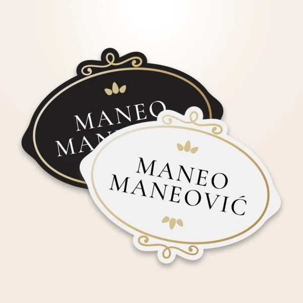 Doživite šarm prošlih vremena u suvremenom ruhu s pločicom “Retro”. Njen jedinstveni ovalni dizajn, ukrašen suptilnim zlatnim detaljima i vašim prezimenom u elegantnom kontrastu crnog na bijeloj podlozi, savršeno spaja vintage estetiku sa suvremenom sofisticiranošću. Ova pločica donosi dozu karaktera i elegancije svakom ulazu, pričajući priču o bezvremenskoj ljepoti koju vaš dom zaslužuje.